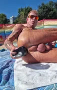 Description: Taking my humungous black fake penis to the nuts at the beach
