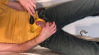 A young furry dude pisses in a rubber, finishes off and is glazed in urine