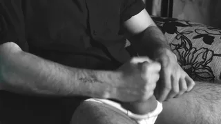The man wanks off close-up with a love glove and blows a load noisily into it.